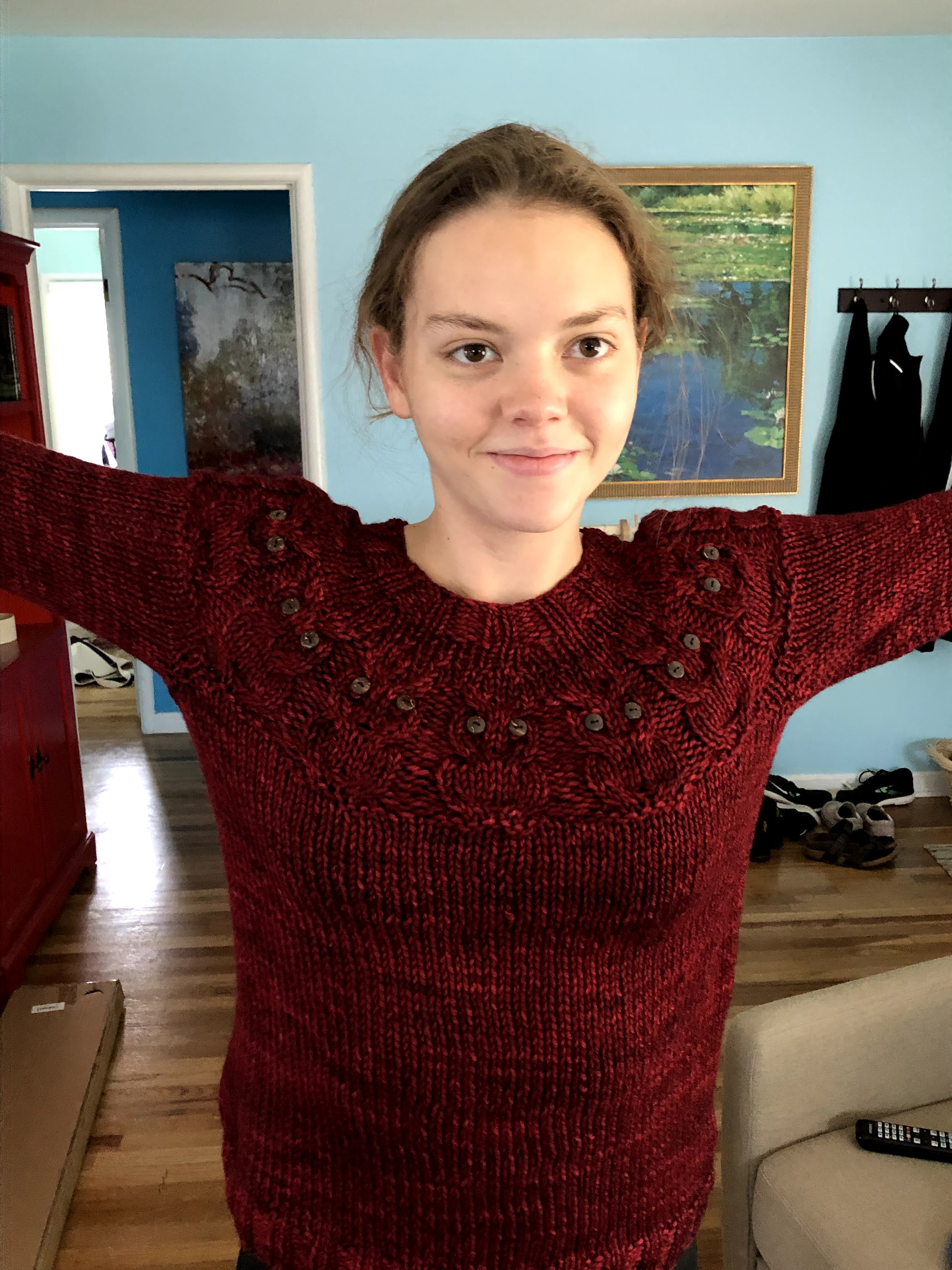 Notes: I made the torso a few inches longer than called for or on kiddo it would have been nearly cropped. Which is a bit odd because she’s fairly short torso’d, so maybe keep an eye on that. She only wanted buttons on the front. And she wanted this to be a comfy/cozy and layering sweater, so not as tight as usual.
