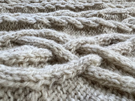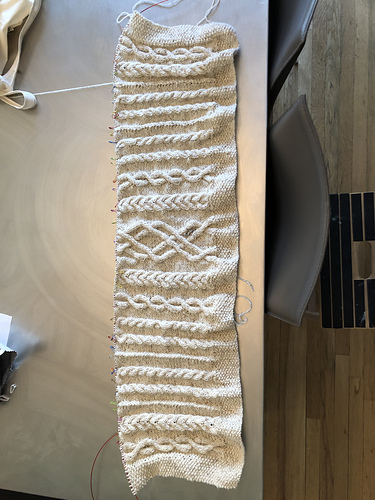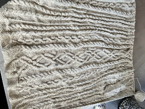 Notes: I added several additional cable panels so it would be a snuggly couch blanket that can cover me fully when reclined.