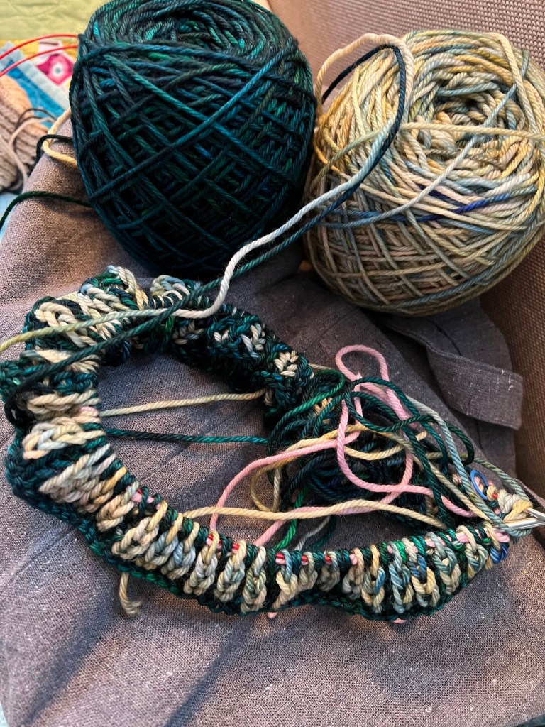 Notes: It’s been a hot second since I did any brioche, and I’ve never done 2-color. The pattern is out of a Modern Daily Knitting Field Guide, and it’s got lots of beautiful brioche patterns. If I’d never done brioche before, I definitely would have needed YT videos. I needed it for 2 color and for doing it in the round. I’m not convinced that I’ve got the beginning of round and end of round stitches just right, I think it will take a few more rounds before I can tell for certain. If I were to bet, I’d say I get to start over again. Which will be fine — brioching is fun, regardless of how much time it takes to make.