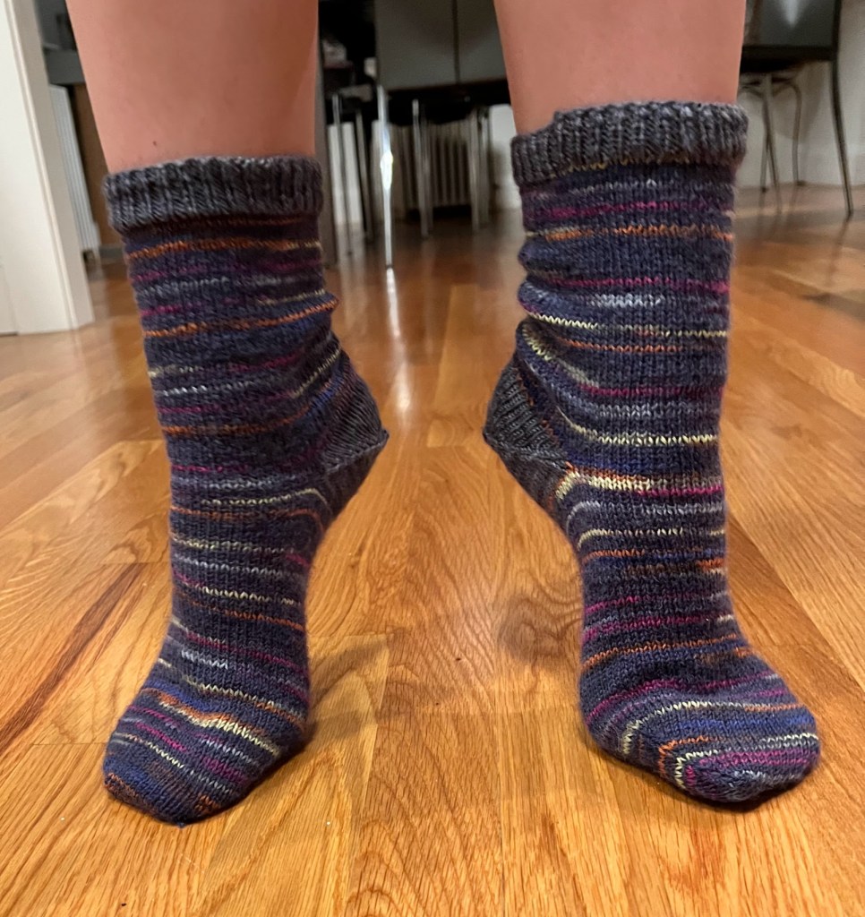 Two feet standing on tip toes wearing dark purple socks with small, random stripes of yellow, orange, pink, white and lighter purple